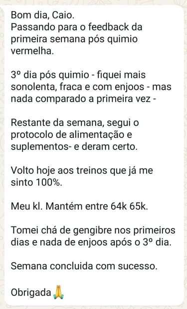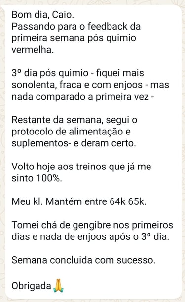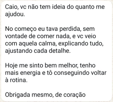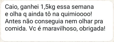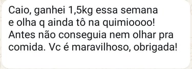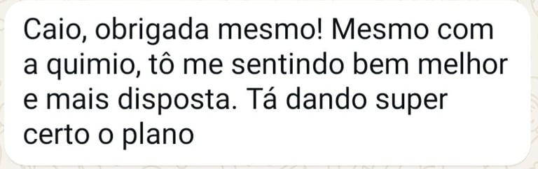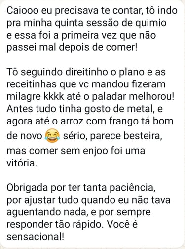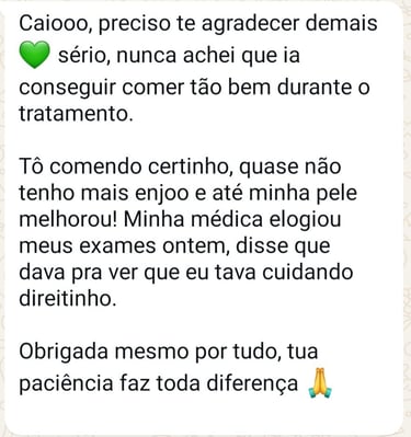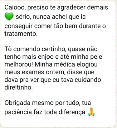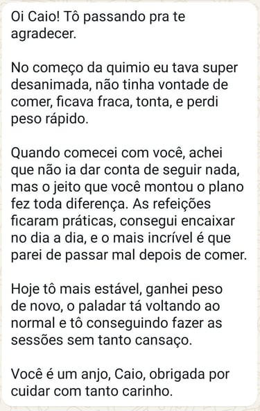 Vou montar o seu plano alimentar e a sua suplementação, além de solicitar e acompanhar seus exames. Estarei ao seu lado durante todo o processo, disponível para você a qualquer momento. Meu objetivo é garantir a sua saúde, com uma alimentação que fortaleça o seu tratamento e mantenha o prazer de comer bem.