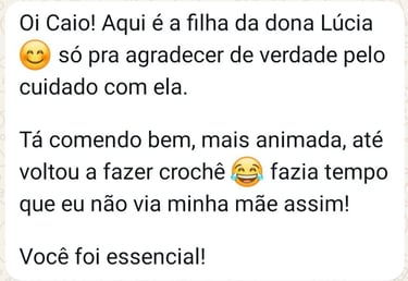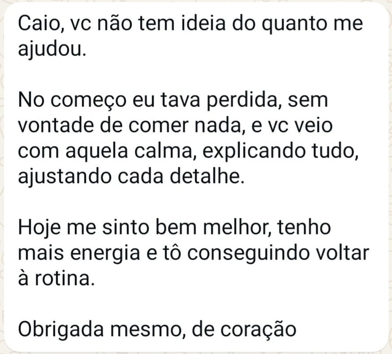 Atendimento personalizado, com acompanhamento próximo e contínuo. Estarei ao seu lado em todas as etapas, seja presencialmente ou online, mantendo contato semanalmente com você